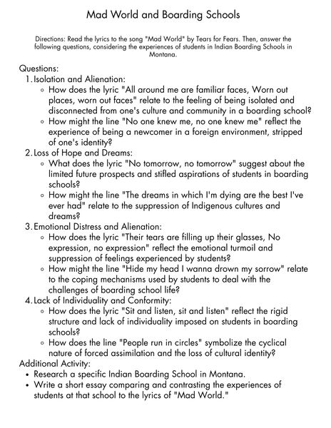 - Whole-class discussion on how the song reflects the emotional experiences of Native American boarding school students.
